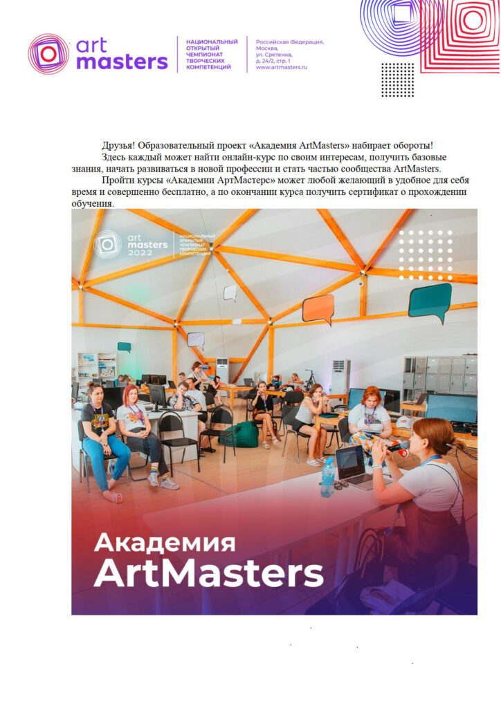 Автономная некоммерческая организация Национальный открытый чемпионат творческих компетенций “АртМастерс (МАСТЕРА ИСКУССТВ)” реализует образовательные мероприятия для школьников 14-17 лет и молодежи 18-35 лет.