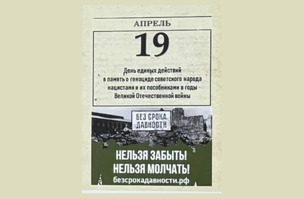 19 апреля – особая дата в сохранении исторической правды о преступлениях нацистов. В этот день в 1943 году был издан Указ Президиума Верховного Совета СССР № 39 «О мерах наказания для немецко-фашистских злодеев, виновных в убийствах и истязаниях советского гражданского населения и пленных красноармейцев, для шпионов, изменников родины из числа советских граждан и для их пособников». Появление этого документа было первым фактом признания целенаправленной и масштабной политики нацистов и их пособников по уничтожению мирного населения на оккупированной территории и наказуемости таких преступлений. Этот Указ Президиума Верховного Совета СССР стал правовым основанием большой работы по установлению и расследованию преступлений нацистов против советского народа, которая велась с ноября 1942 г. Чрезвычайной государственной комиссией по установлению и расследованию злодеяний немецко-фашистских захватчиков.