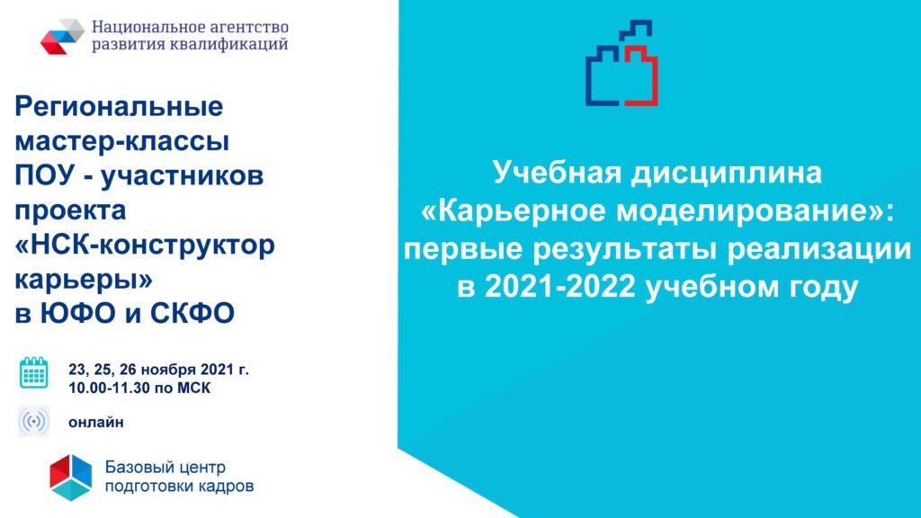 Уважаемые коллеги! Профессиональные образовательные учреждения Южного федерального округа и Северо-Кавказского федерального округа при поддержке Базового центра АНО НАРК, региональных органов управления образованием, Донского УМЦ ПО проводят региональные мастер-классы «Учебная дисциплина «Карьерное моделирование»: первые результаты реализации в 2021-2022 учебном году». В ходе мастер-классов руководящие и педагогические работники, студенты узнают о реализации проекта «НСК – конструктор карьеры» […]