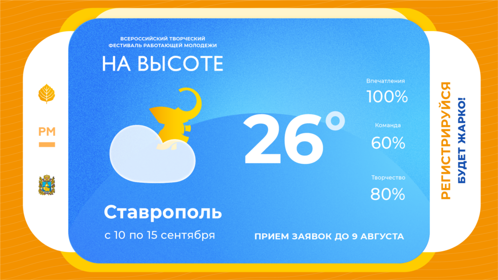 Стартовал прием заявок на первый Всероссийский творческий фестиваль работающей молодёжи «На высоте» С 10 по 15 сентября в Ставрополе состоится Всероссийский творческий фестиваль работающей молодежи «На высоте». Он объединит 2500 молодых людей в возрасте от 18 до 35 лет со всей России. Фестиваль станет первым в России творческим проектом для работающей молодежи, сочетающий образовательную программу […]